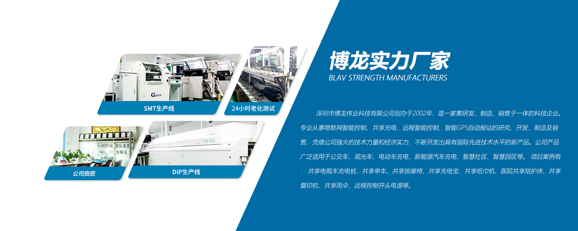 深圳市博龍偉業(yè)科技有限公司創(chuàng)辦于2002年,是一家集研發(fā)、制造、銷售于一體的科技企業(yè)。專業(yè)從事物聯(lián)網(wǎng)智能控制、共享充電、遠程智能控制、智能GPS自動報站的研究、開發(fā)、制造及銷售,憑借公司強大的技術力量和經(jīng)濟實力,不斷開發(fā)出具有國際先進技術水平的新產(chǎn)品。公司產(chǎn)品廣泛適用于公交車、觀光車、電動車充電、新能源汽車充電、智慧社區(qū)、智慧園區(qū)等。 項目案例有: 共享電瓶車充電樁,共享單車、共享按摩椅、共享充電寶、共享紙巾機、醫(yī)院共享陪護床、共享復印 機、共享雨傘、遠程控制開頭電源等。